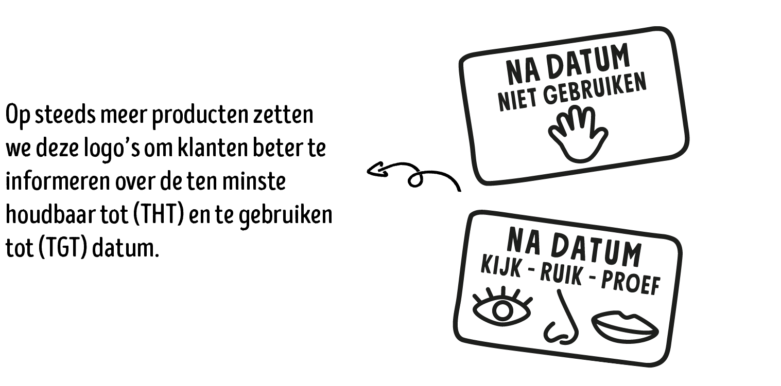 Een deel van de voedselverspilling bij klanten thuis wordt veroorzaakt door onduidelijkheid over de ten minste houdbaar tot (THT) en te gebruiken tot (TGT) datum. Daarom willen we onze klanten hierover beter informeren. Dit doen we door de toevoeging van het Kijk-Ruik-Proef logo op producten met een THT-datum. Dit helpt klanten te bepalen of een product na de THT-datum nog eetbaar is door te kijken, te ruiken en te proeven. Op producten met een TGT-datum vermelden we een andere tekst: na datum, niet gebruiken. Ons doel is dat in 2027 de helft van alle relevante private label producten dit logo draagt. Dit is een afspraak binnen de Coalitie Houdbaarheid, onderdeel van onze samenwerkingsverband met Samen Tegen Voedselverspilling.