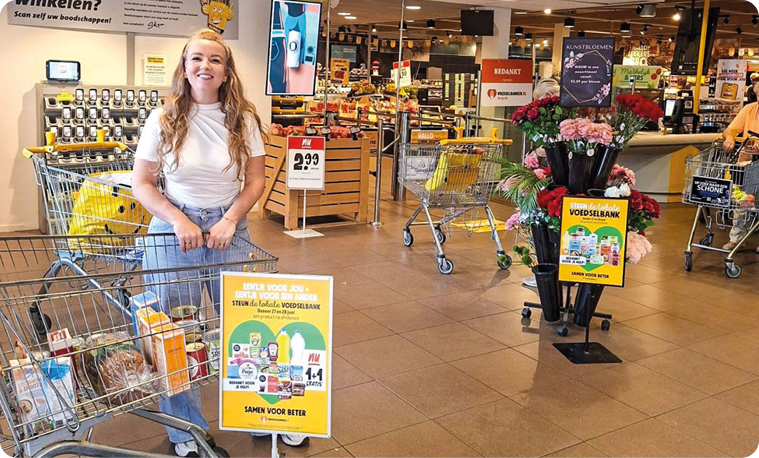 Dit dilemma vraagt om anders denken. We zoeken actief naar nieuwe manieren om de voedselbanken te blijven ondersteunen. Zo doneren we bij tijdelijke winkelsluitingen vanwege verbouwingen het volledige verse en ingevroren assortiment aan de voedselbank. En breiden we de jaarlijkse landelijke donatieactie uit waarbij klanten en winkels samen producten inzamelen.