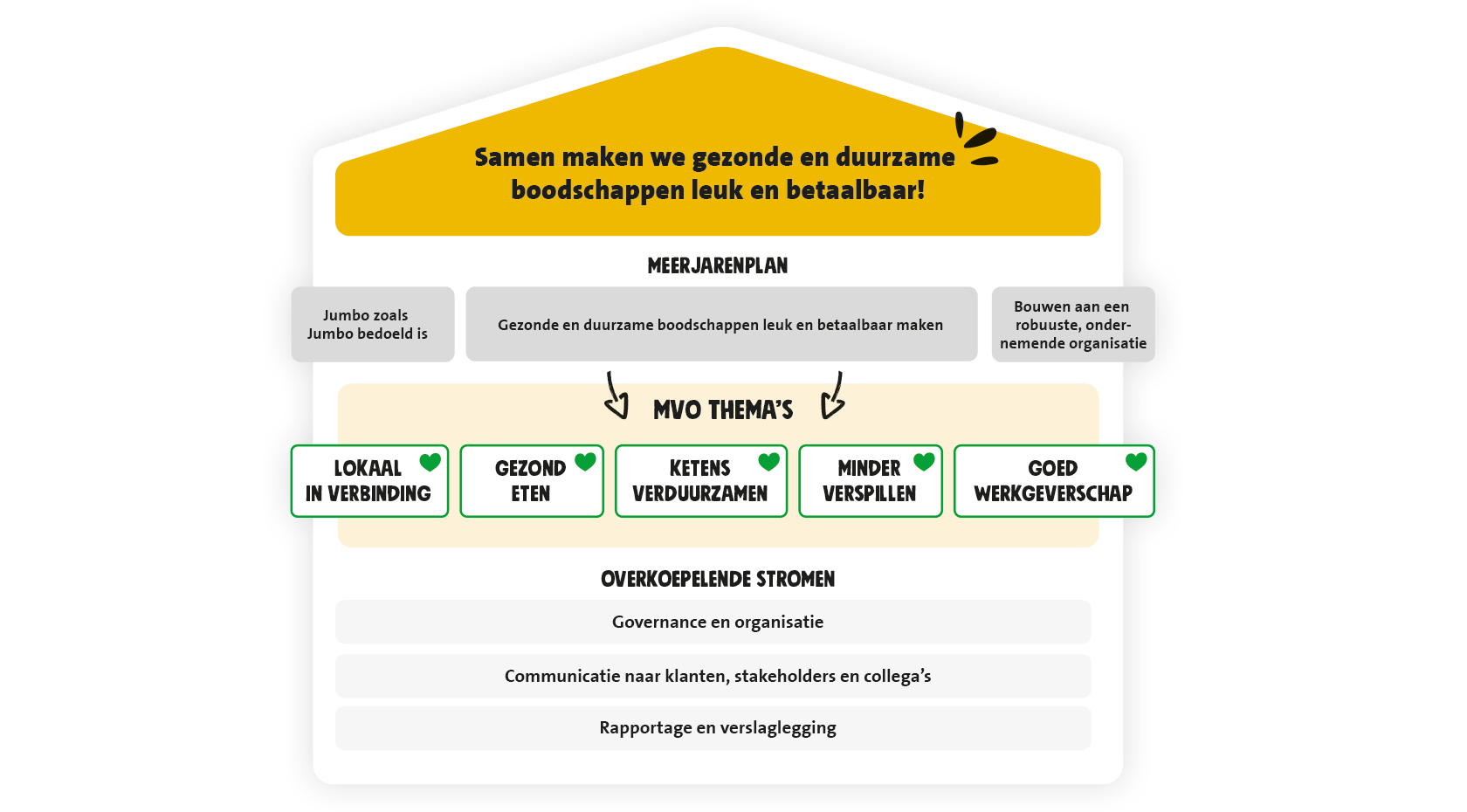 Onze strategische koers is uitgewerkt in het Jumbo Meerjarenplan (MJP). Hierin leggen we de nadruk op vijf speerpunten: