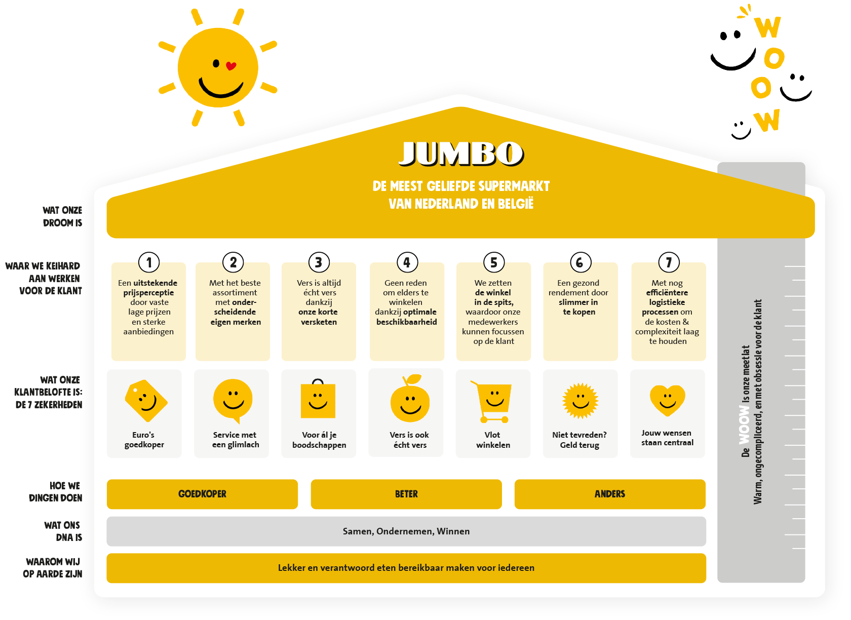 Bij Jumbo willen we lekker en verantwoord eten bereikbaar maken voor iedereen. Daar doen we het voor en we zien 'verantwoord' als duurzaam geproduceerd en goed voor de gezondheid van de mens. Met 'bereikbaar' bedoelen we dat de klant ons altijd en overal kan vinden en dat onze boodschappen betaalbaar zijn. Op basis van ons Jumbo DNA werken we met elkaar en met onze partners samen, en onderscheiden we ons doordat wij de dingen 'goedkoper, beter en anders' doen. Altijd met nét dat stapje extra. En natuurlijk met onze 7 Zekerheden. Die blijven van kracht en zijn kenmerkend voor Jumbo. Tot slot gaan we er de komende jaren, met de speerpunten uit ons Meerjarenplan, voor zorgen dat we onze droom gaan realiseren: de meest geliefde supermarkt van Nederland en België zijn.